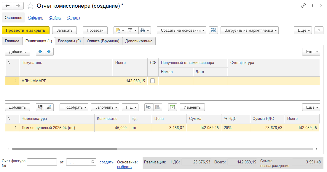 После сопоставления выполните повторную загрузку отчета. Документ автоматически заполнится данными о продажах OZON.