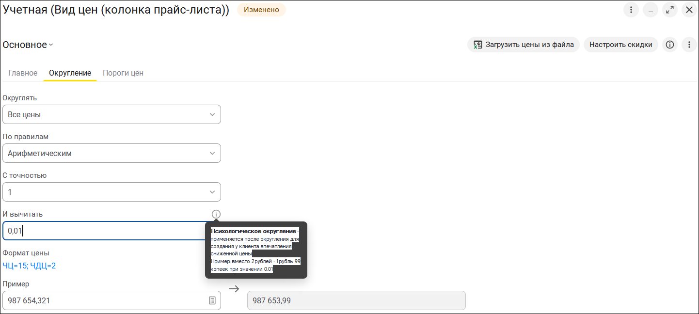 При печати ценников теперь учитываются настройки психологического округления, заданные в поле "И вычитать" вида цены. Цены будут распечатаны уже с учетом округления. Например, если для цены установлено значение "вычитать 0,01", то при цене 100 руб. на ценнике отобразится 99,99 руб.