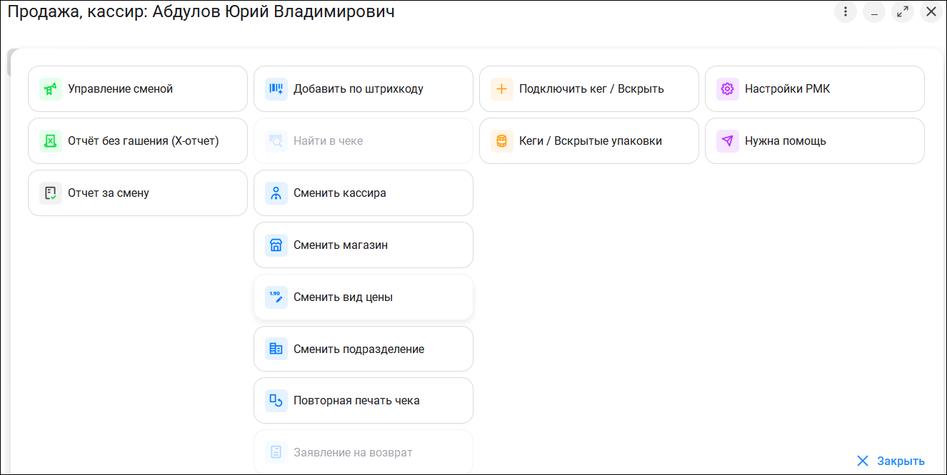 Сделали управление кассовыми сменами более прозрачным и контролируемым. Для этого предусмотрено интерактивное окно, которое открывается автоматически или по одноименной команде меню "Еще".
