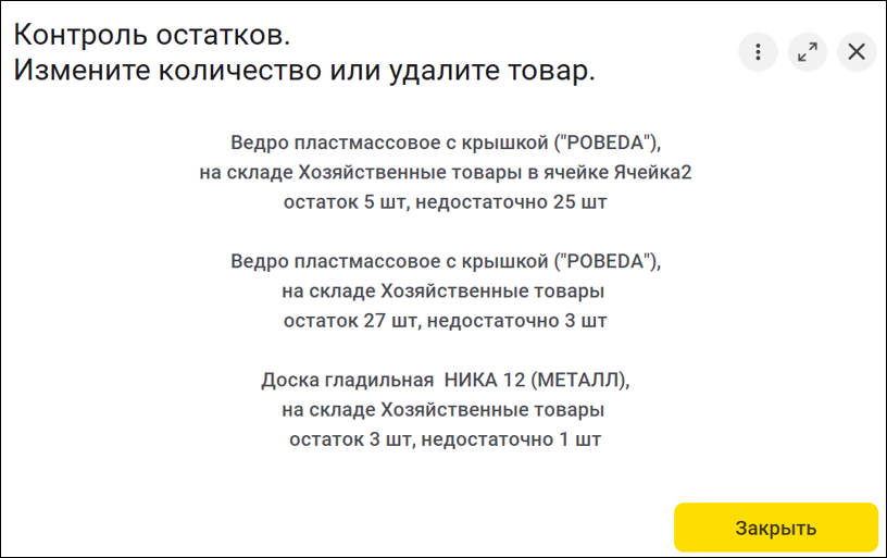 Реализовали контроль остатков на складах с ячеистой структурой. Теперь при оформлении оплаты, если в выбранных ячейках не хватает остатка, появится подробное сообщение с предложением удалить товар или изменить количество. Оплатить чек не удастся. Опция позволит избежать лишних операций по ручной проверке остатков и оформлению возвратов.