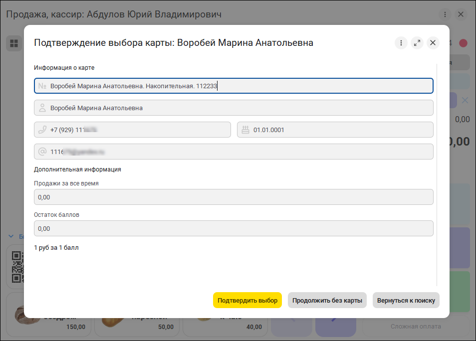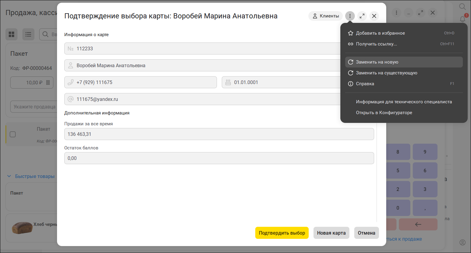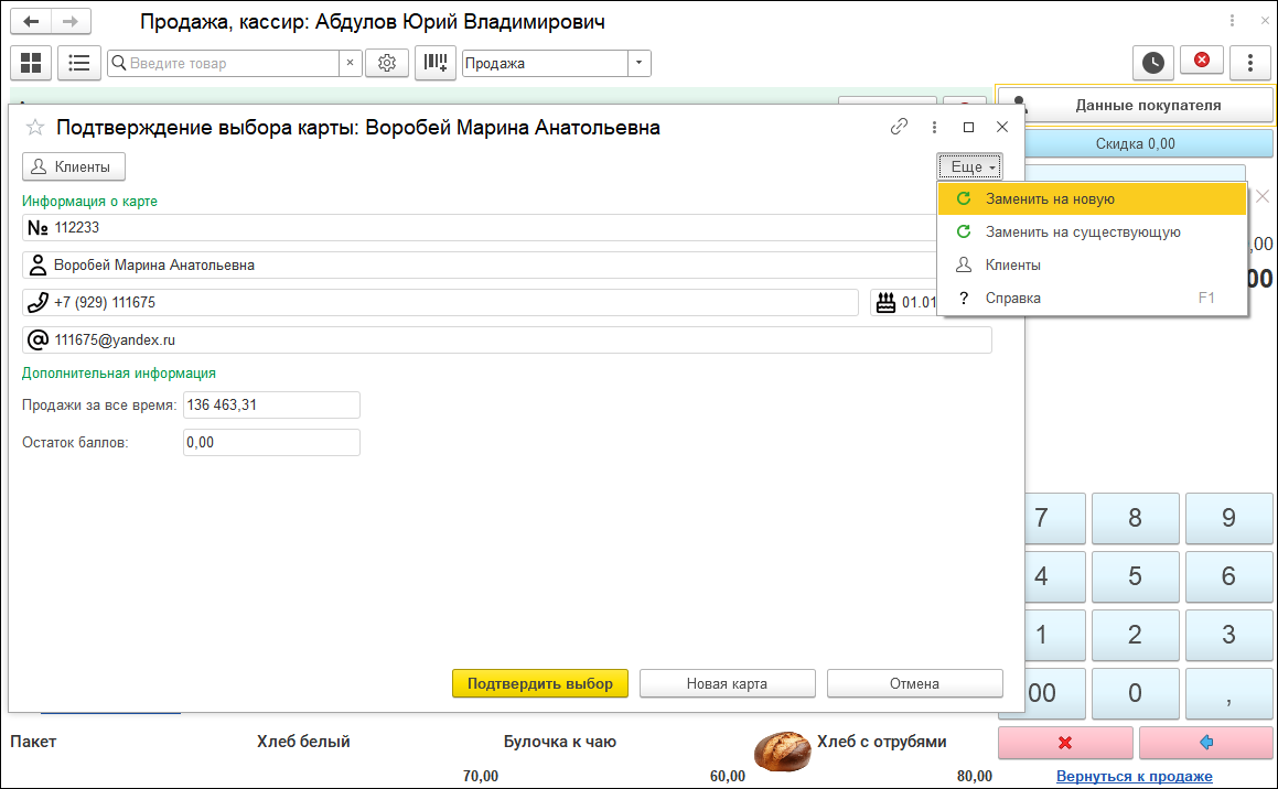 После выбора карты, данные о покупателе будут перенесены в "стакан" РМК. Для подтверждения данных и печати согласия на обработку персональных данных нужно нажать на иконку покупателя. В новом меню "Еще" доступна замена карты.