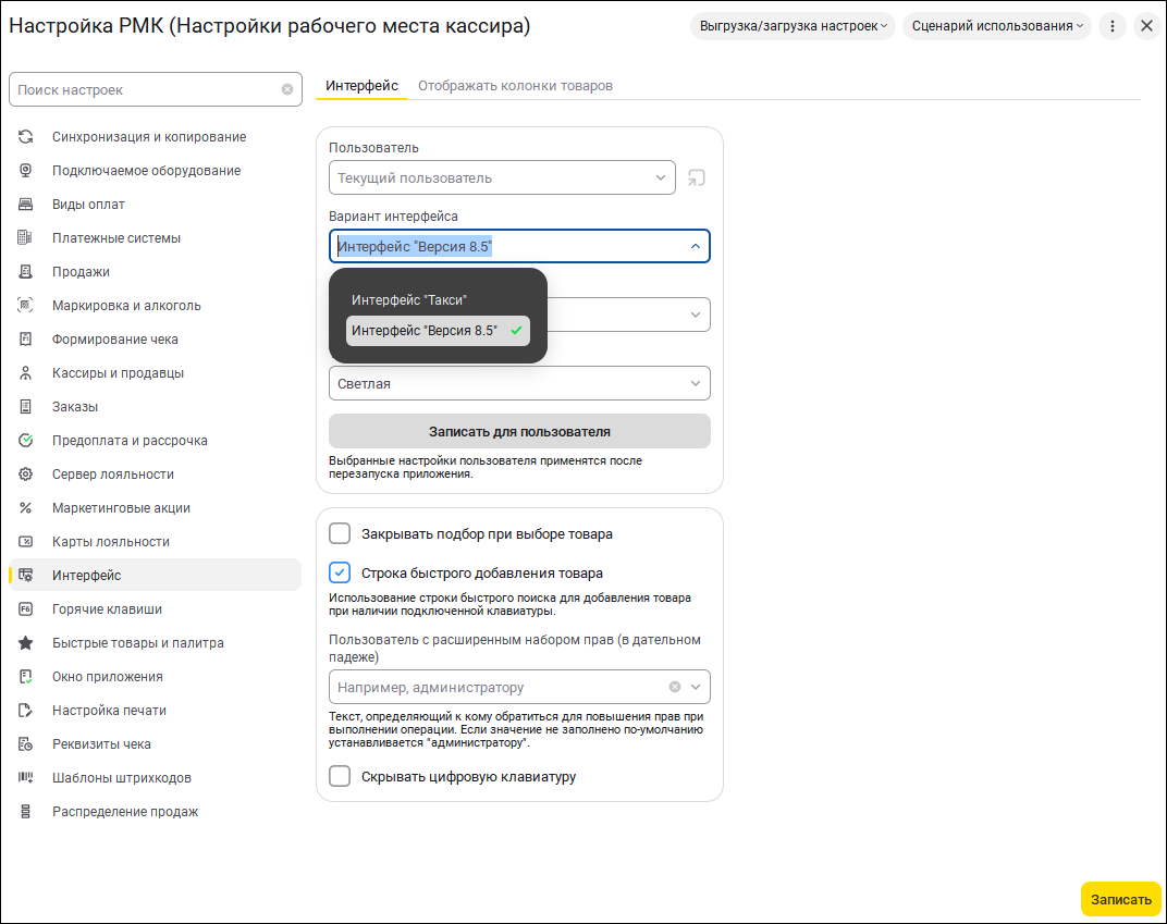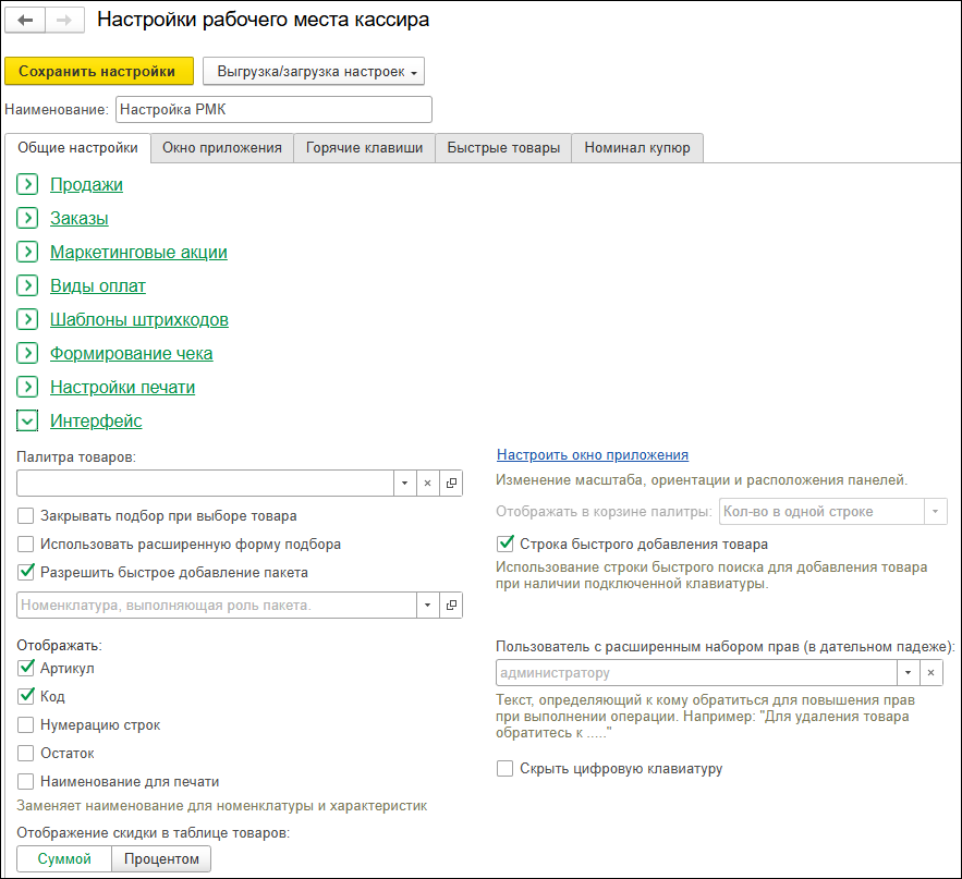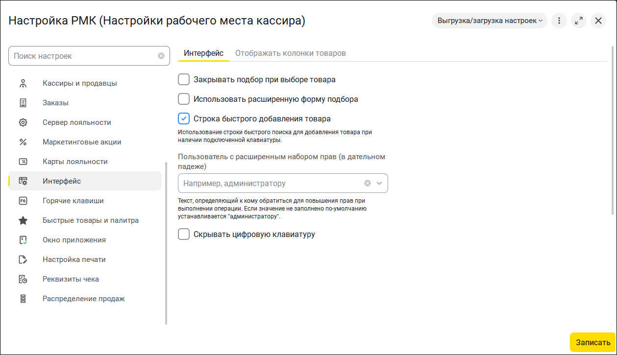 Ключевые разделы, такие как "Интерфейс" и "Отображать колонки товаров",