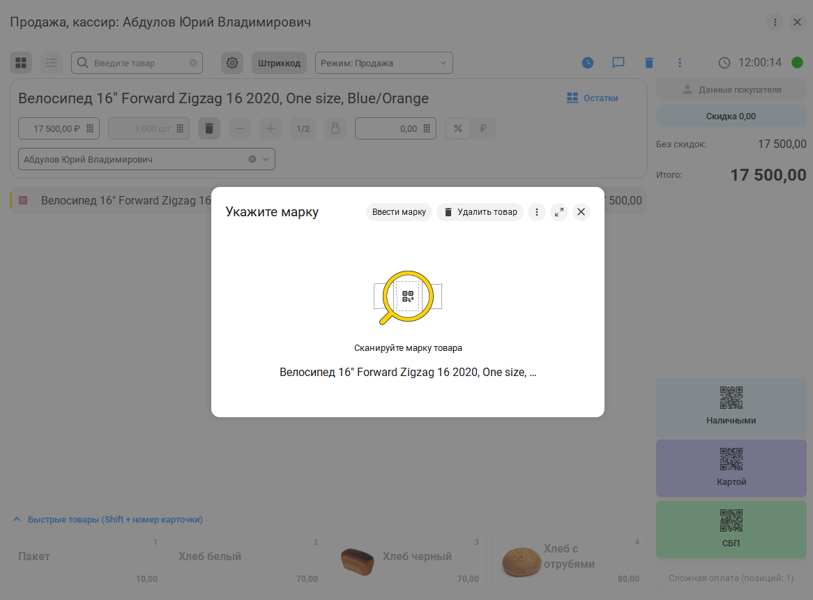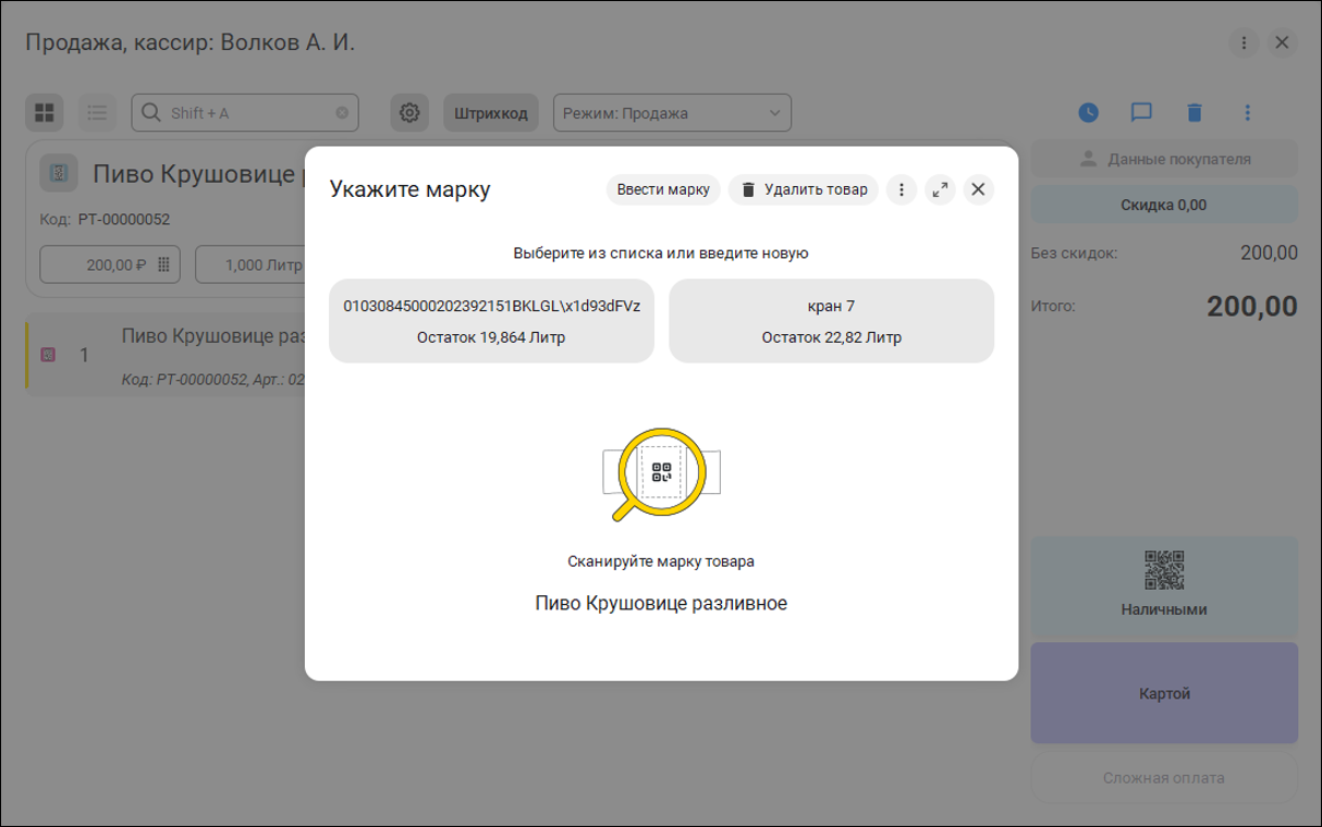 После добавления товара, если серия или партия обязательна к заполнению, откроется окно для ввода штрихкода с возможностью выбора из списка.