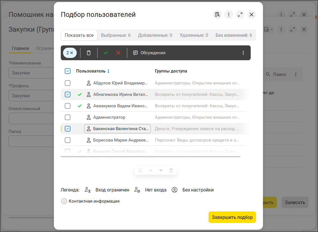 Программа позволяет создавать код сотрудника и выводить его на печать. В "Группу доступа" сотрудников можно добавлять через функцию подбора. Здесь же показываются уже добавленные пользователи. Удаление из группы выполняется нажатием на значок "Крестик".