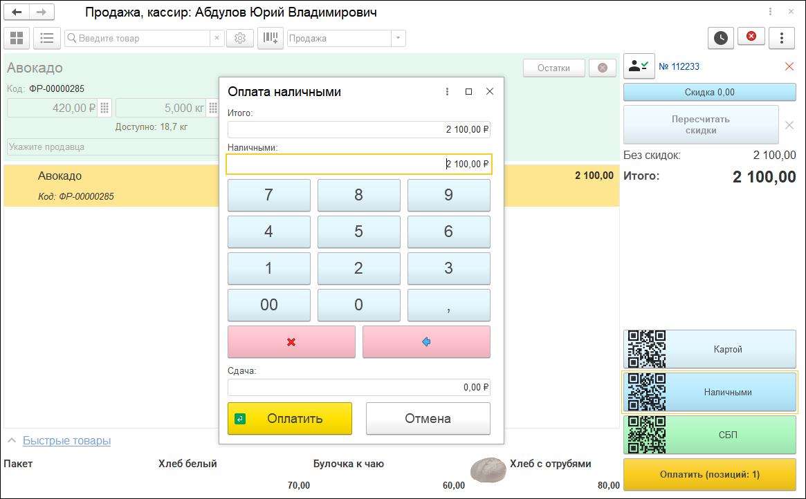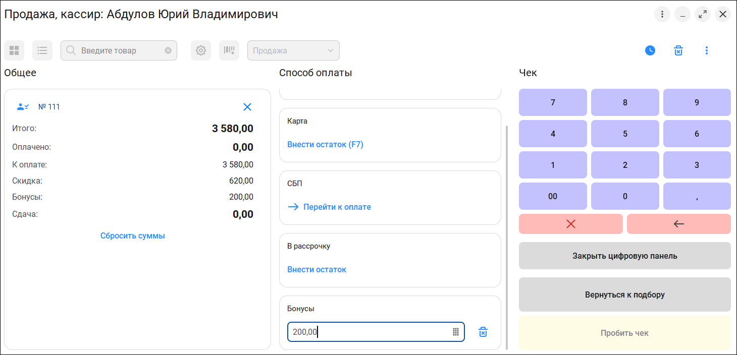 При быстрой оплате наличными и наличию бонусного остатка ввод данных разделен на 3 этапа: ввод суммы бонусов, ввод СМС, если сумма бонусов больше установленной настройки и ввод суммы наличных. Быстрая оплата картой предполагает два первых этапа.