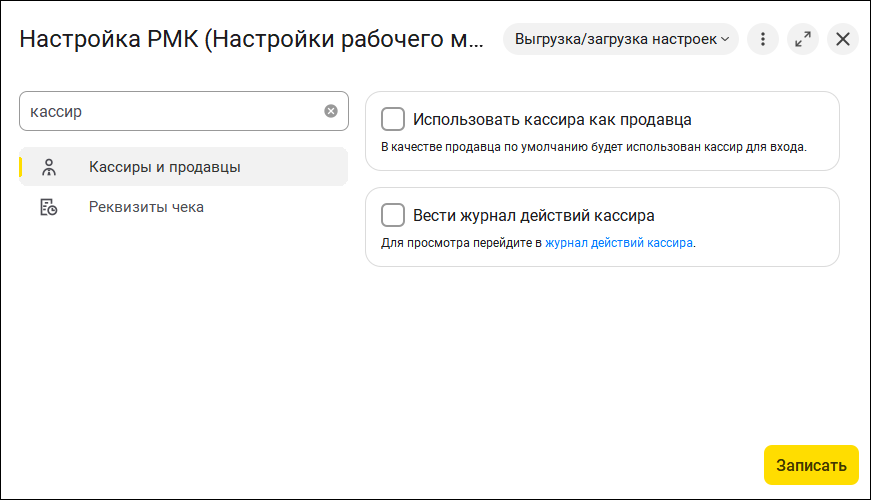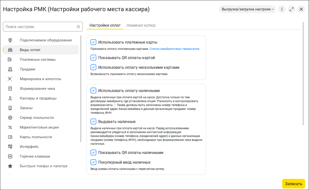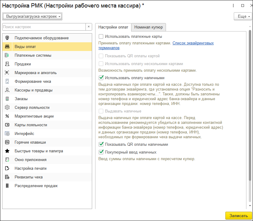 Зависимые настройки теперь скрыты до активации основного параметра — это исключает ошибки и упрощает процесс. А за счет единообразных подсказок вместо устаревших команд все опции выглядят и воспринимаются одинаково легко. Так, если используем "Покупюрный ввод наличных", то справа от "Настроек оплат" отобразится закладка "Номинал купюр".