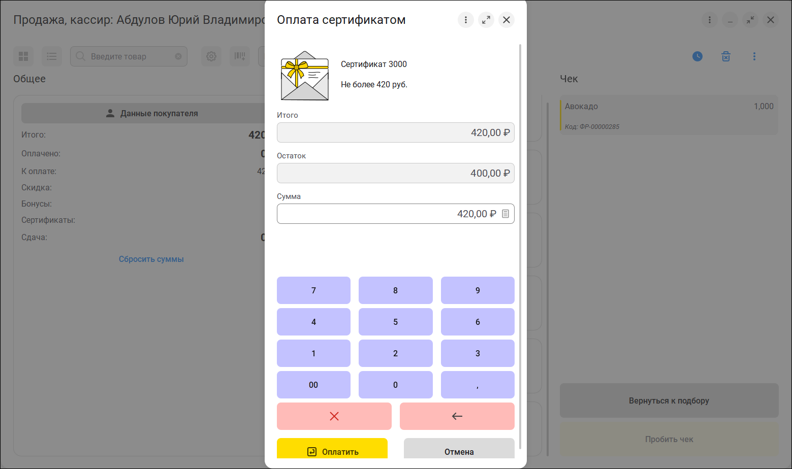 Улучшили работу с подарочными сертификатами. Искать сертификат и принимать оплату им стало удобнее. Поэтапный поиск позволяет быстрее ориентироваться в интерфейсе. Добавили возможность не только добавлять и удалять сертификаты, но и редактировать суммы оплаты, что дает возможность более гибкой работы с покупателем.
