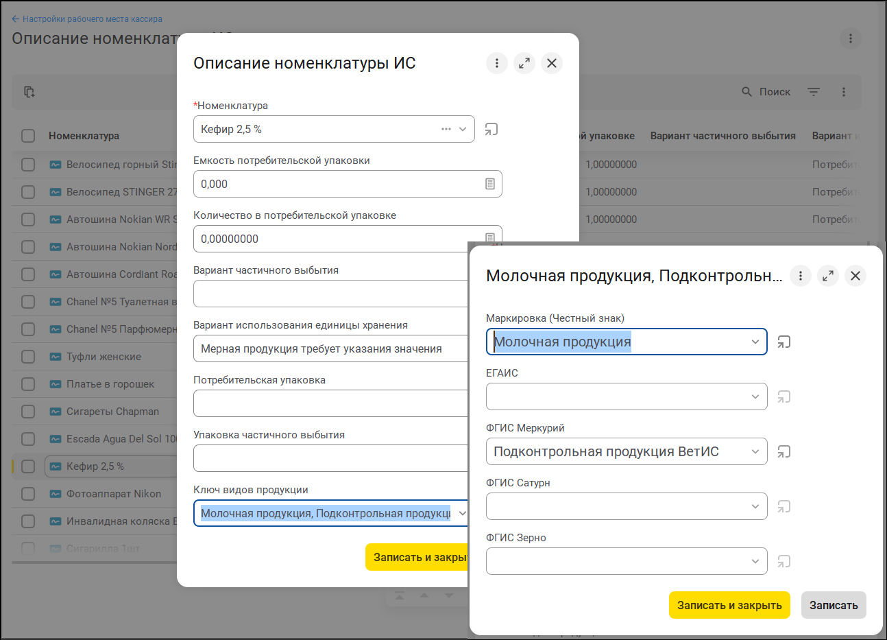 Например, виды номенклатуры ИС "Молочная продукция, подконтрольная ВЕТИС" и "Молочная продукция неподконтрольная ВЕТИС" были двумя разными видами продукции ГИС МТ ("Честный знак"), что могло запутать и затруднить выбор. Теперь просто выбираем "Молочную продукцию" и, если нужно, то в отдельном поле дополняем деталями интеграции с ВЕТИС ("ФГИС Меркурий").