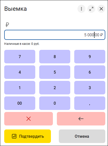 Операции выемки и внесения денежных средств выполняются через отдельные универсальные формы.