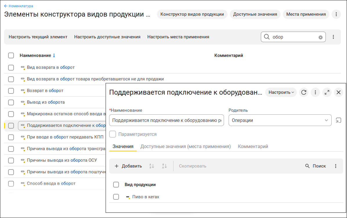Так как "Виды продукции" стали элементами справочников и могут быть изменены, то при работе с маркируемой продукцией теперь используется "конструктор элементов", где каждый элемент содержит ссылки на подходящий вид товаров. Так, чтобы определить, может ли продукция быть подключена к оборудованию розлива, используется не вид продукции ИС "Пиво" или "Безалкогольное пиво", как раньше, а конкретный элемент конструктора "Поддерживается возможность подключения к оборудованию розлива".