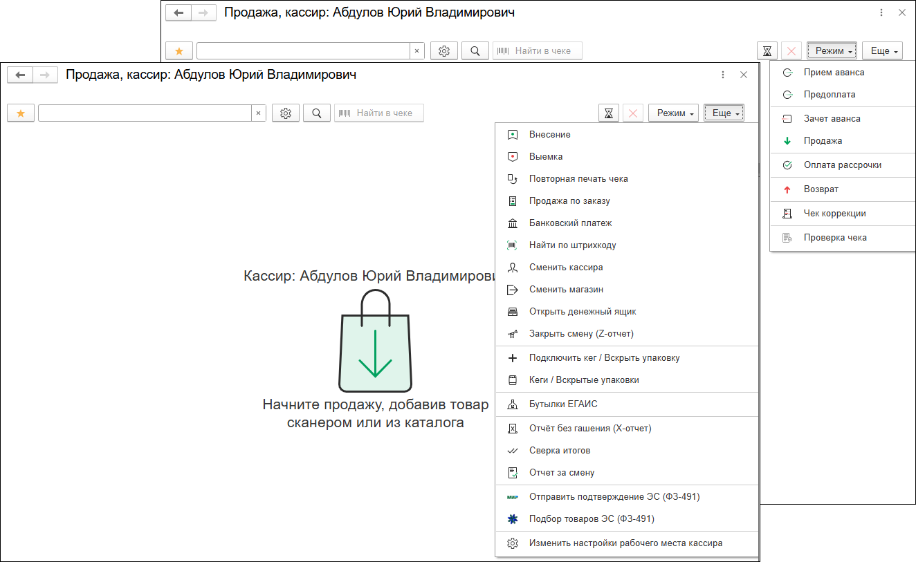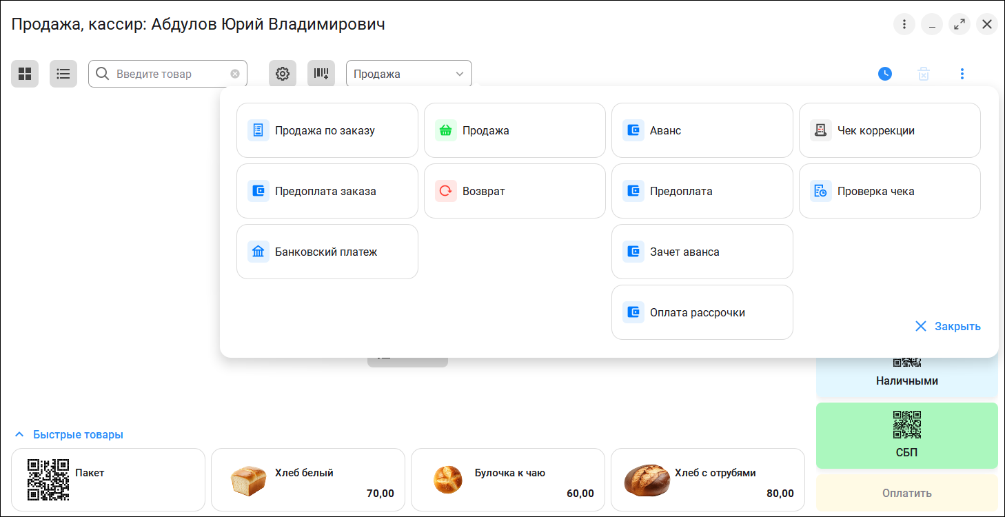 В ранних версиях режимы работы с чеком и дополнительные команды выглядели как длинный список команд. Теперь все основные режимы работы объединены в просторном выпадающем списке, по умолчанию выбран вариант "Продажа".