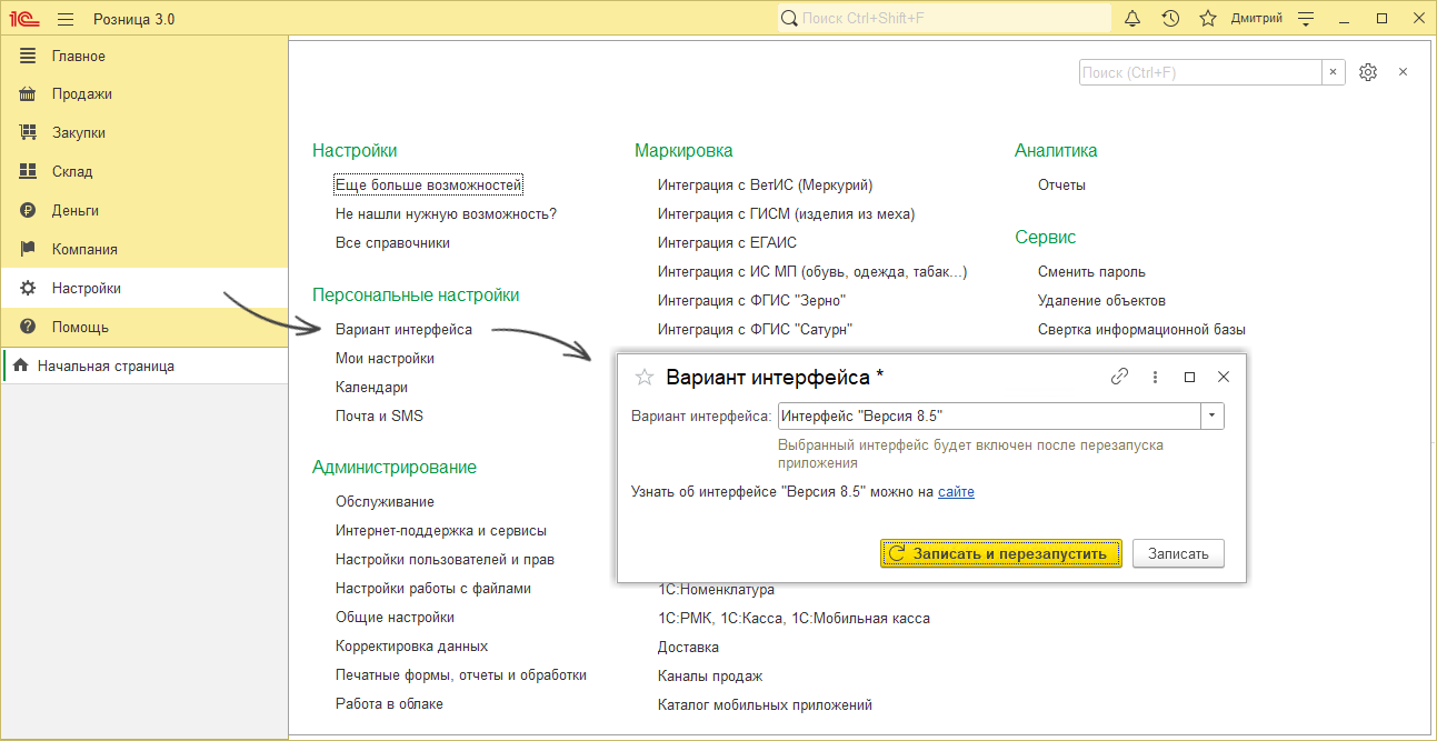 Для переключения на новый интерфейс 8.5 откройте раздел "Настройки" - подраздел "Персональные настройки" - "Вариант интерфейса". В открывшейся форме выберите вариант "Интерфейс "Версия 8.5" и нажмите "Записать и перезапустить". С помощью таких же действий можно вернуться обратно в интерфейс "Такси".