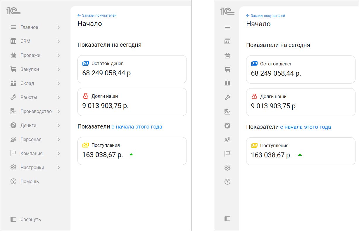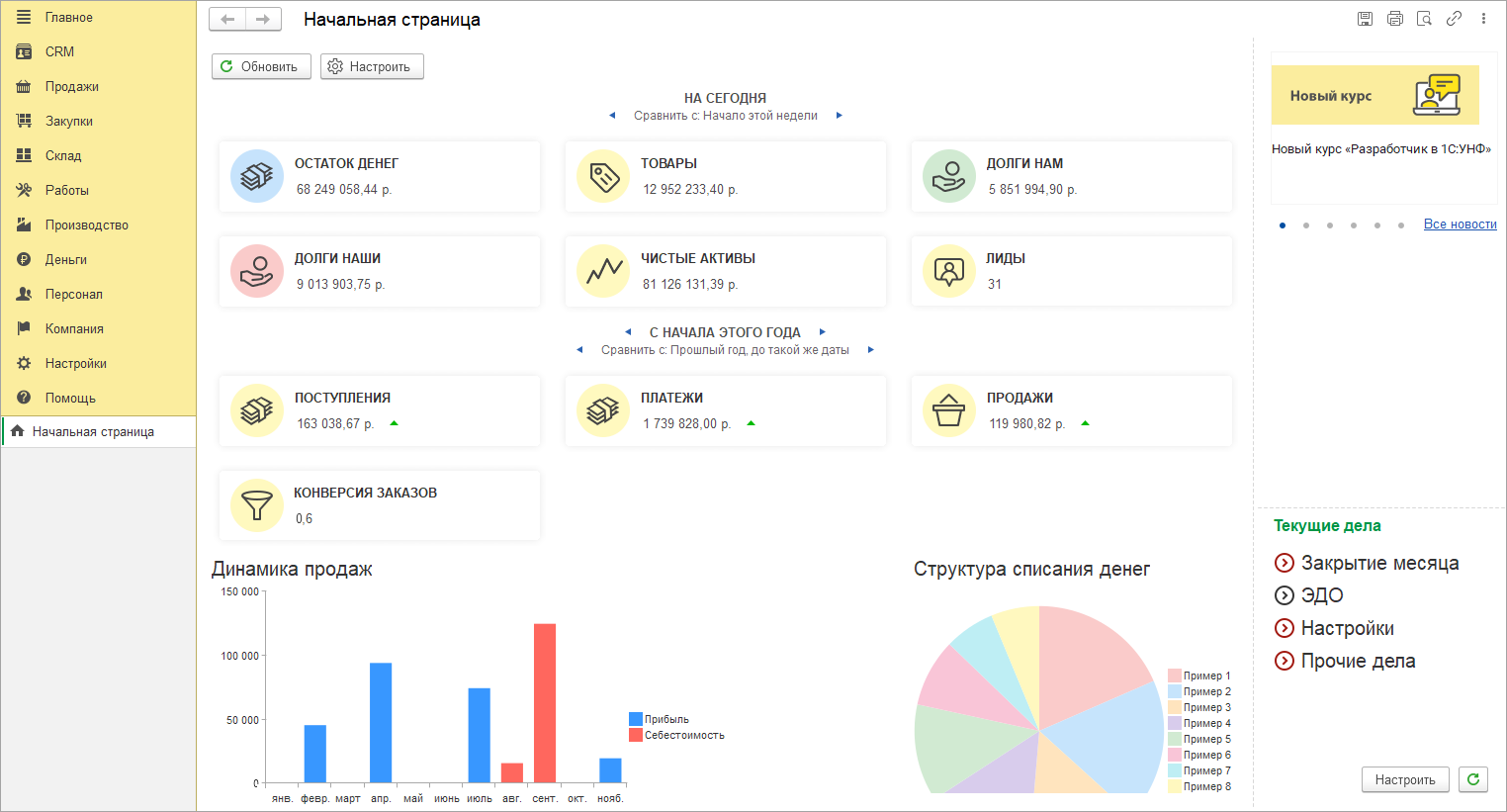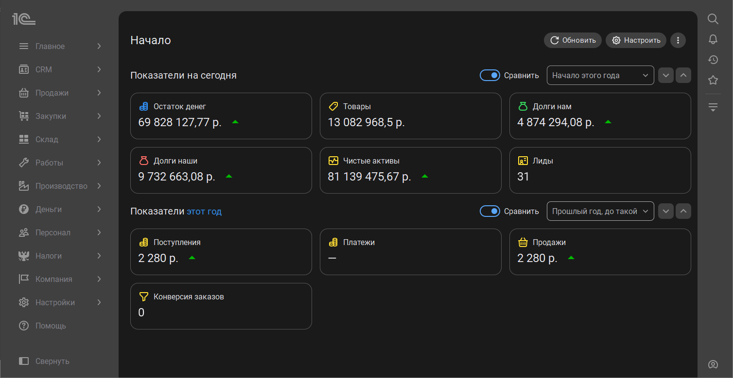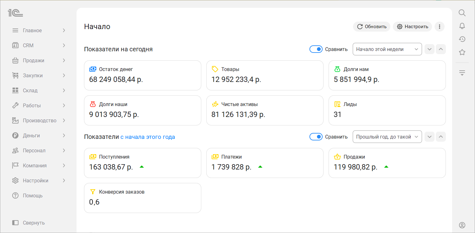 В новом интерфейсе 8.5 сразу после запуска вас встречает начальная страница. Для руководителя она, как и раньше, отражает текущие дела компании: показатели на сегодня и за период, рисует графики продаж.