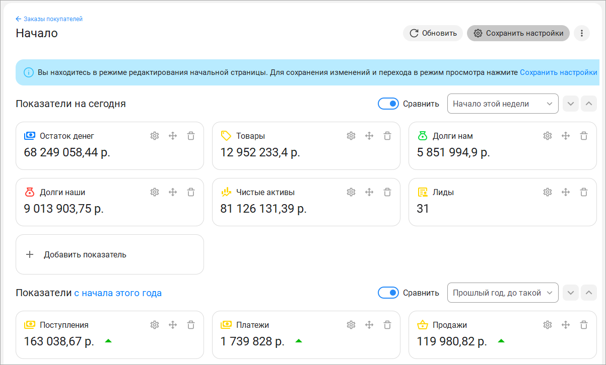 Сохранилась возможность настроить показатели: добавить новые, переместить значимые, скрыть неактуальные. Включить режим редактирования можно по кнопке "Настройки", напротив каждого показателя появятся иконки.