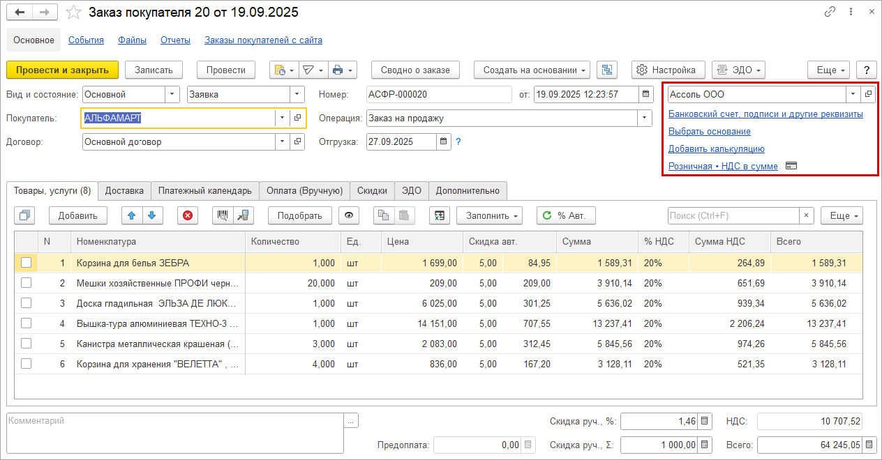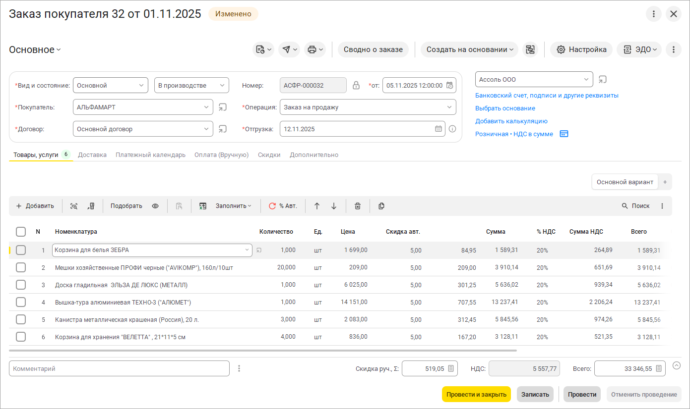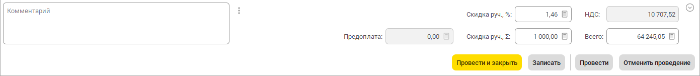 В свернутом виде доступны только ключевые значения: сумму скидки, НДС, итоговую сумму документа.