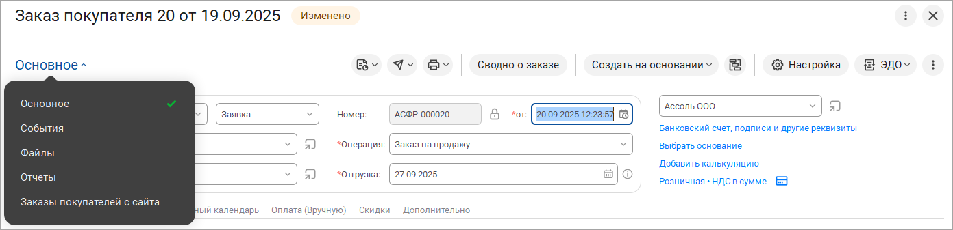 Закладки навигации документа теперь компактно собраны в меню "Основное". С его помощью можно быстро перейти к прикрепленным файлам и контекстным отчетам.