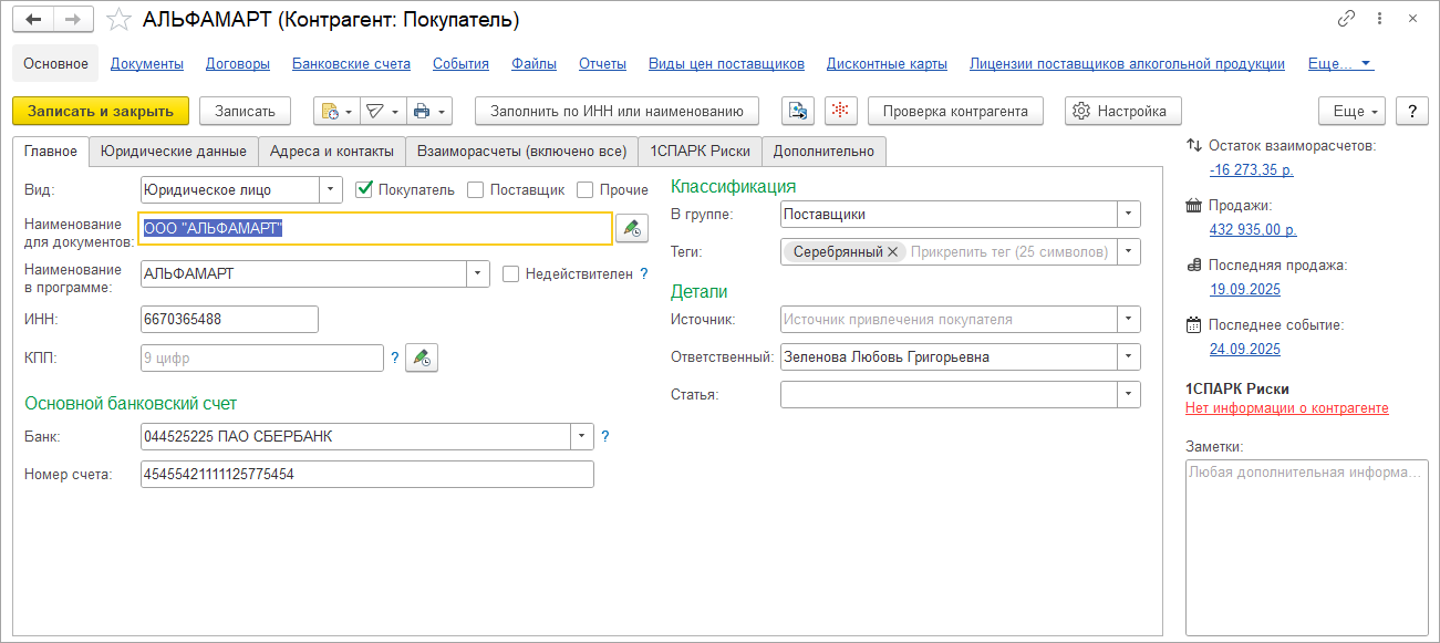 Полная информация о контрагенте теперь расположена на отдельных закладках: юридические данные, адреса и контакты, взаиморасчеты, досье 1СПАРК Риски.