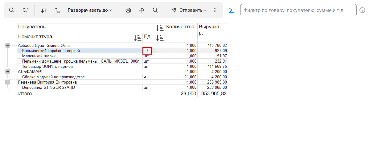 В таблицах документов можно быстро выбрать и изменить несколько строк, даже если они идут не по порядку. Для этого достаточно отметить флажками нужные строки и выбрать команду в появившемся меню.
