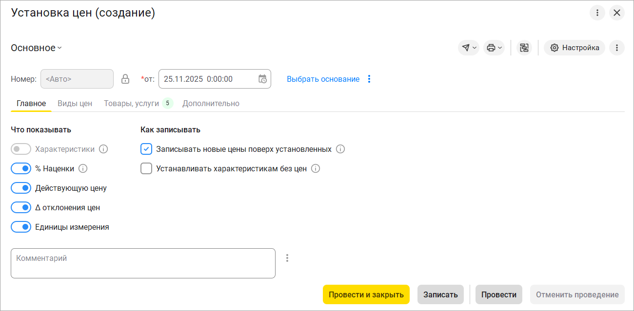 В форме документа на наведенное поле отобразится синяя рамка. Текущий раздел табличной части отобразится более темным шрифтом с желтой горизонтальной полосой. Кнопка "Провести и закрыть" также будет отображена в желтом цвете, что позволяет создать акцент на ней.