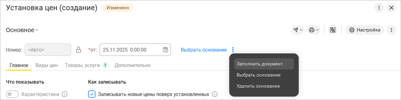 Во всех основных документах в шапке появляется третья колонка, в которую собраны ссылки действий: выбор счета организации, реквизиты для печати, выбор основания.