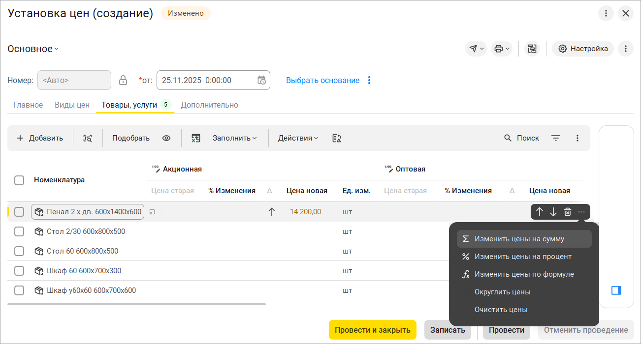 Кнопка "Изменить" теперь появляется только если выделены элементы в списке и называется "Изменить выделенные". С ее помощью можно пересчитать цены и скидки, заполнить серии и номера ГТД и многое другое.