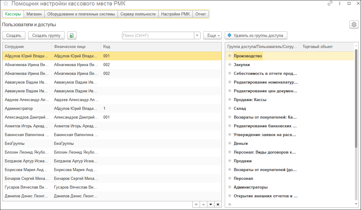 В ключевом разделе настройки РМК «Кассиры» мы переработали основные команды. Теперь можно добавить одного кассира или сразу несколько. Для этого необходимо выделить одного или несколько сотрудников в левой таблице, выбрать группу доступа в дереве справа и выполнить команду "Включить в группу". Добавленные кассиры должны появится справа в группе доступа.