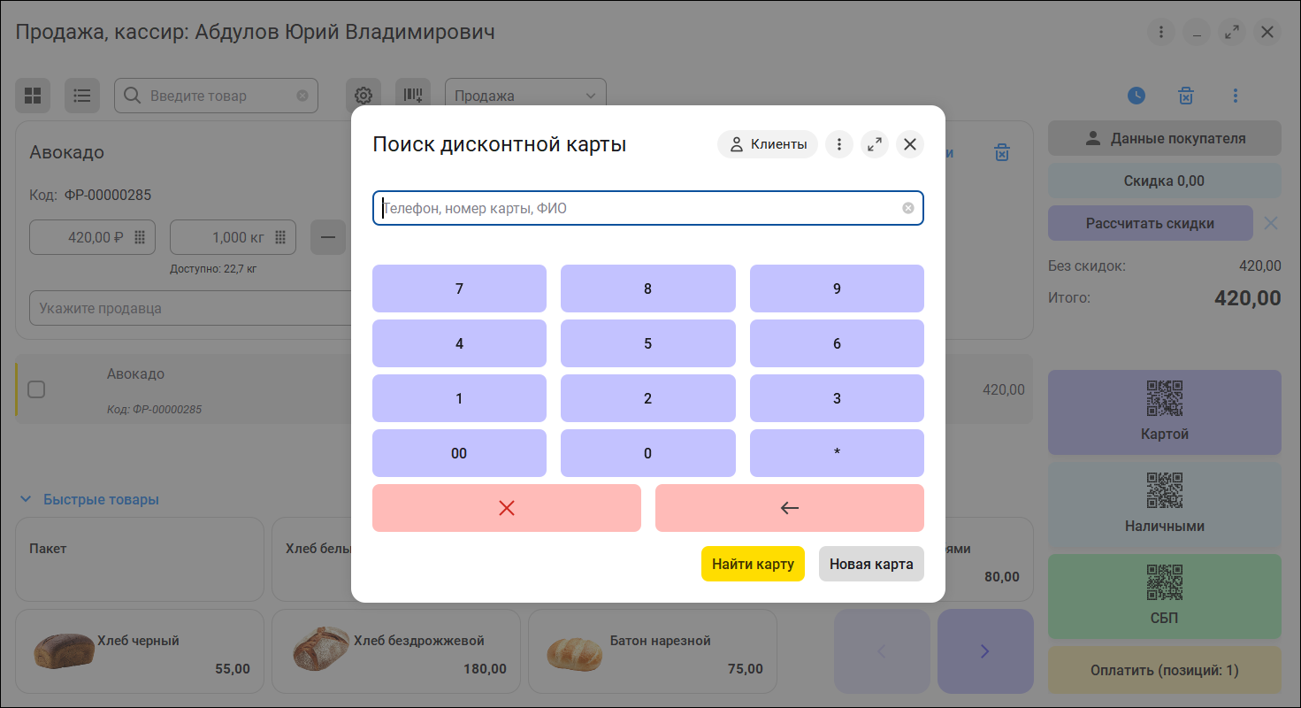В режиме быстрой оплаты картой или наличными, если установлена настройка "Напоминать о вводе карты" и карта лояльности не введена, то будет выведена форма ввода карты лояльности.