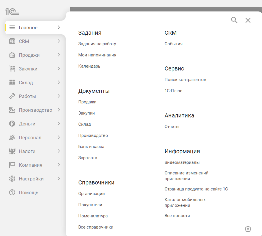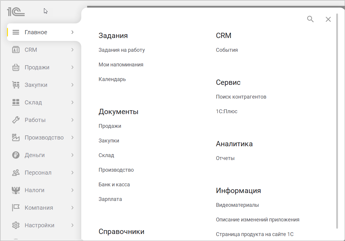 Главное меню, как и раньше, состоит из двух уровней. На первом находятся основные разделы — "Главное", "Продажи", "Закупки", "Деньги", "Компания" и