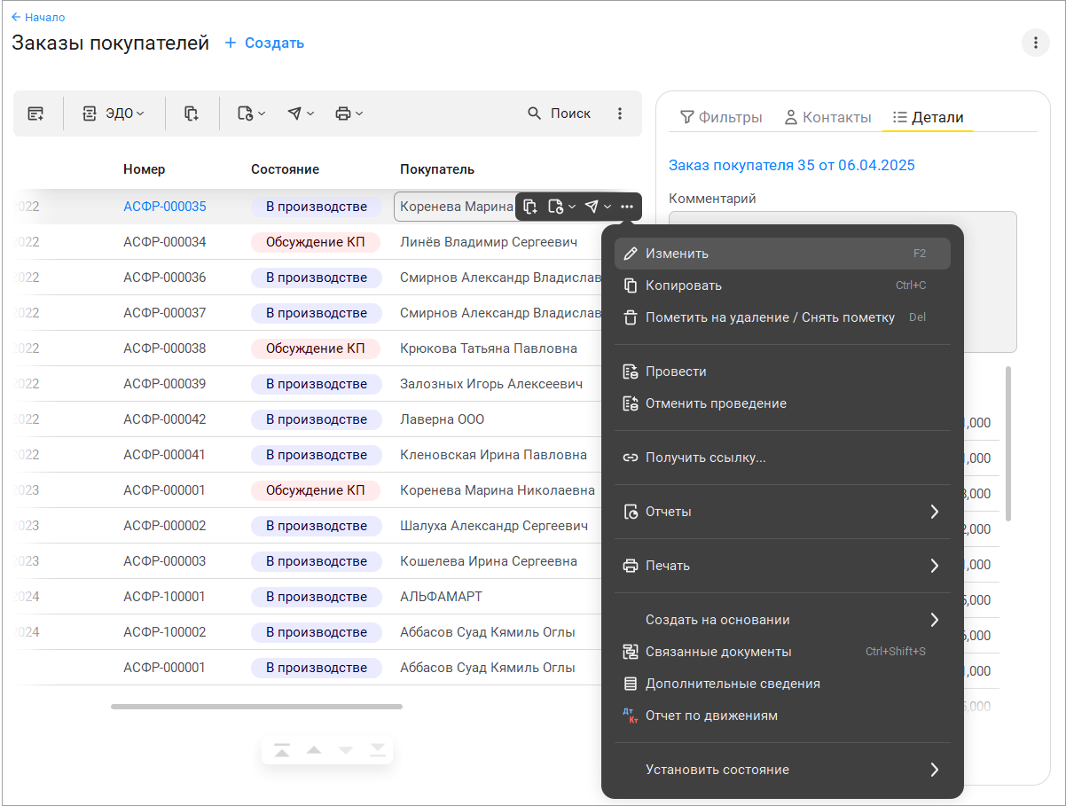 Правая панель теперь состоит из трех страниц: Фильтры, Контакты, Детали. На каждой из них скомпонована краткая информация о выбранном документе.