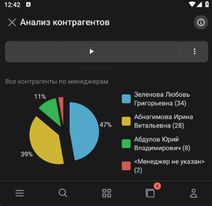 В мобильном интерфейсе также поддержана темная тема. Все графические элементы, в том числе диаграммы и графики, считываются так же хорошо, как и в темной теме настольной версии.