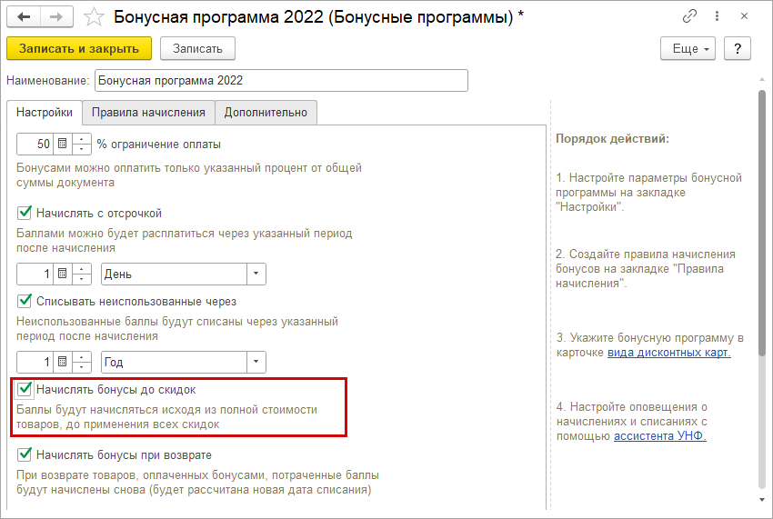 Для настройки начисления в карточку бонусной программы добавили флажок "Начислять бонусные баллы до вычета всех скидок". Если флажок установлен, бонусные баллы за покупку будут начисляться от полной стоимости товаров до применения всех скидок.