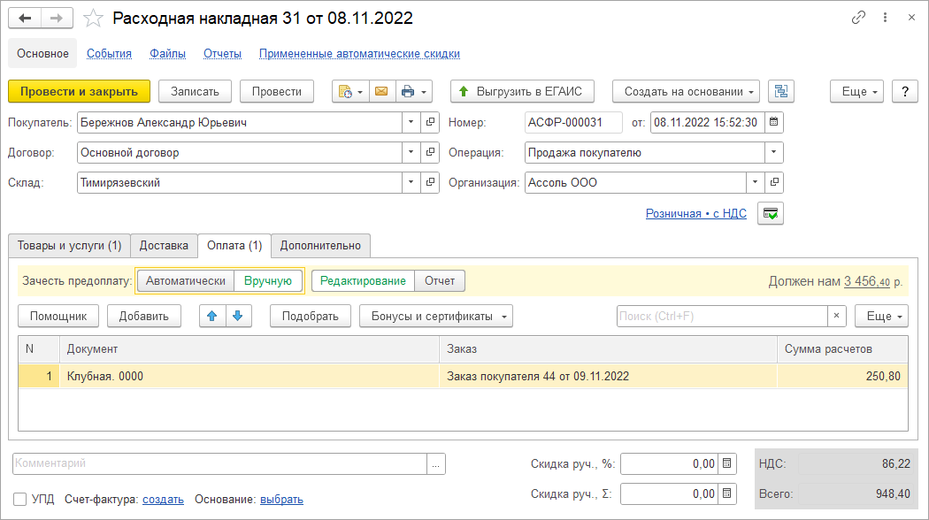 При оплате баллами в документе "Заказ покупателя" баллы списываются сразу при проведении документа. В документе отгрузки, созданном на основании заказа, оплата баллами отображается на вкладке "Предоплаты". Списание баллов в таком документе не выполняется.