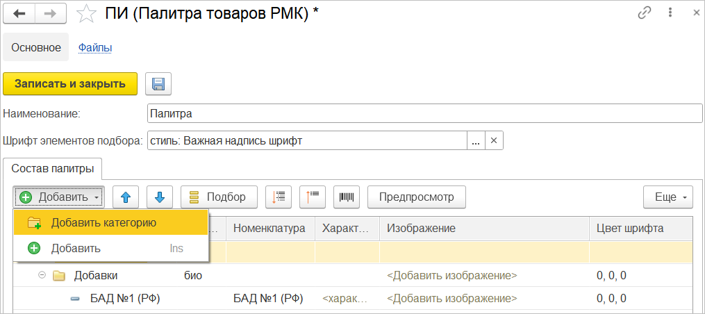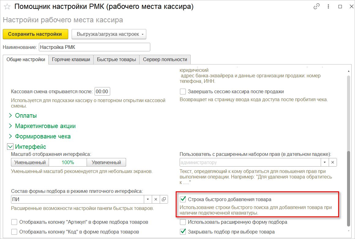 Добавить товар в палитру можно в разделе "Интерфейс" настроек РМК любым удобным способом: сканированием штрихкода, из формы подбора, стандартной командой Добавить.