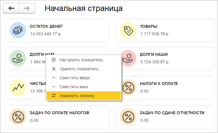 Появилась новая возможность для настройки стартовой страницы. Теперь можно управлять порядком вывода виджетов на стартовой странице и выбирать место расположения. Возможность доступна по команде «Изменить колонку». Команда может быть вызвана нажатием правой кнопки мыши по названию показателя.