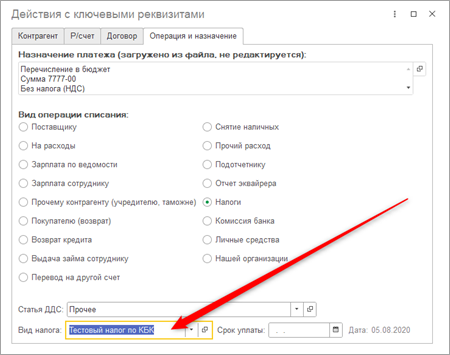 Последнее выбранное значение вида платежа запоминается и используется при создании нового документа. При загрузке платежа с видом операции «Налоги» по КБК подставляется вид налога.