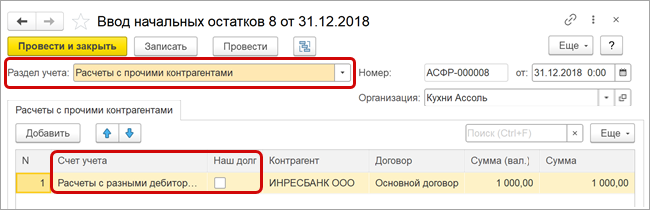 В табличной части с помощью флажка «Наш долг» можно ввести как долг нашей компании перед прочим контрагентом, так и долг прочего контрагента перед нашей компанией по аналогии с флагом «аванс».