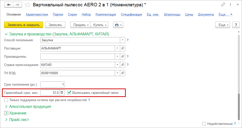 При загрузке номенклатуры из файлов, например Excel, появилась возможность записать в карточку товара данные о гарантии.