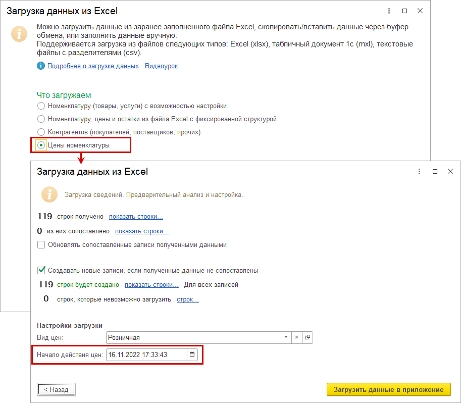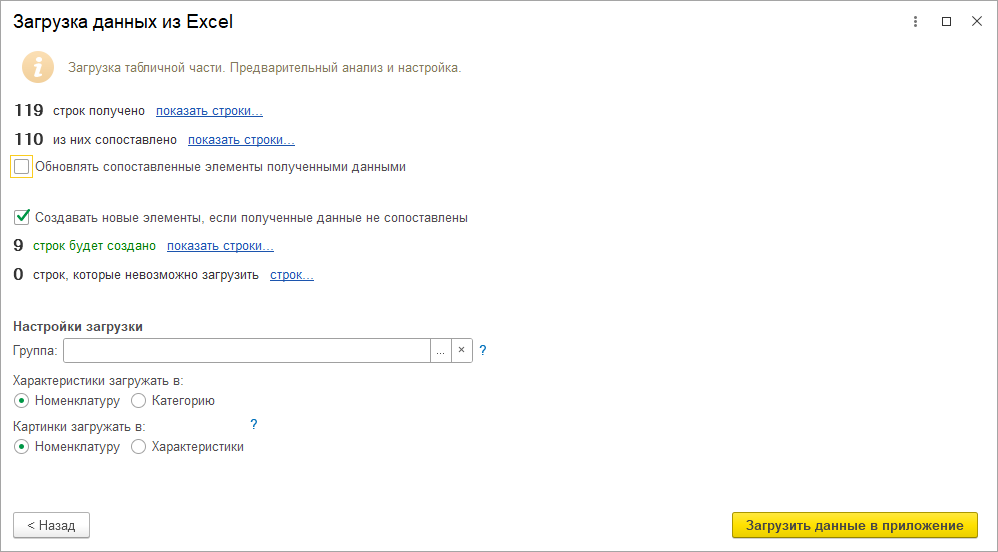 В помощник загрузки данных из Excel добавлены реквизиты для сопоставления.