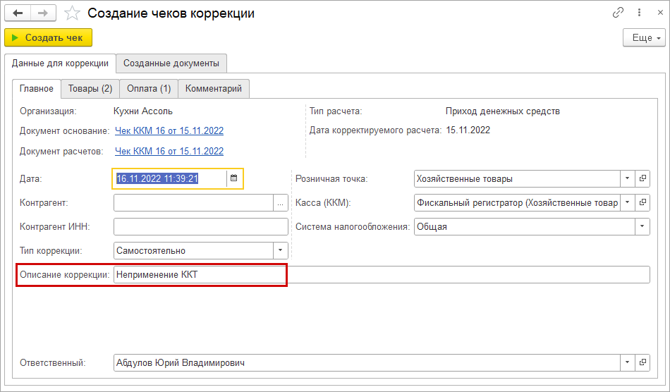 Форма автоматически заполнятся данными из чека ККМ. В поле "Описание коррекции" устанавливается значение "Неприменение ККТ".