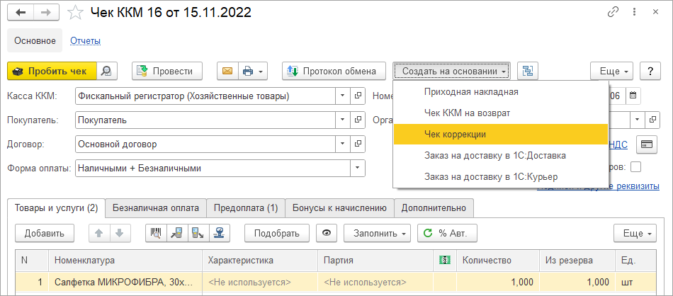Ранее ввод данных в чеке коррекции выполнялся вручную. Теперь документ "Чек коррекции" можно создать на основании непробитого "Чека ККМ" и сразу заполнить его данными чека.