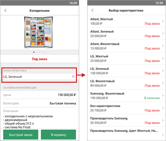 В новой версии мобильного "Кабинета клиента" изменилось отображение характеристик товаров. Стало удобнее выбирать товары, имеющие большой список вариаций (характеристик).