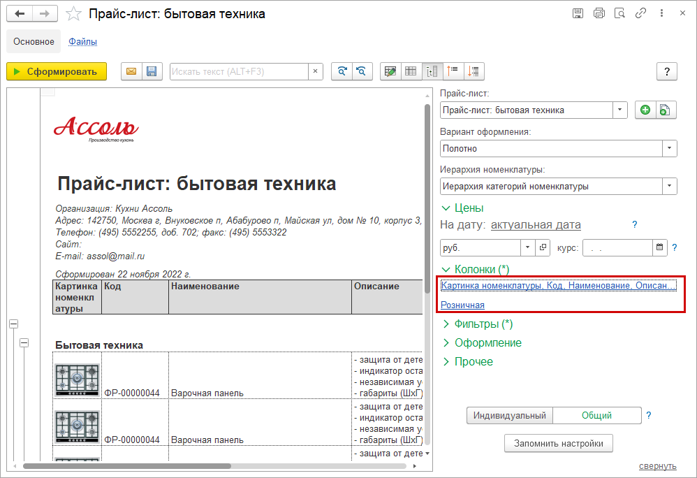 Теперь для колонок прайс-листа можно применить расширенные возможности настройки (СКД). Например, теперь в прайс-лист можно добавить реквизиты номенклатуры в том числе дополнительно заданные пользователем: картинки характеристик, картинки со штрихкодами товаров.