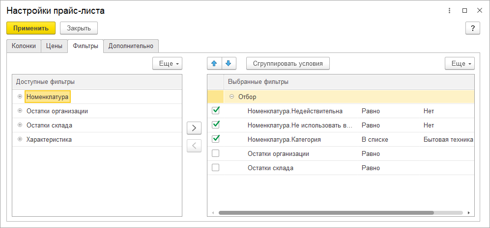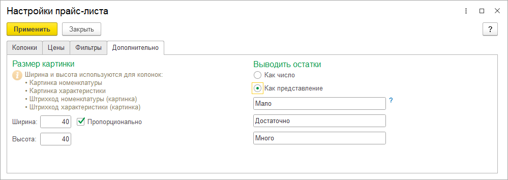 Условия вывода остатков, как и раньше, позволяют показать в прайс-листе точное значение остатков или относительное: много или мало товара осталось на складе.