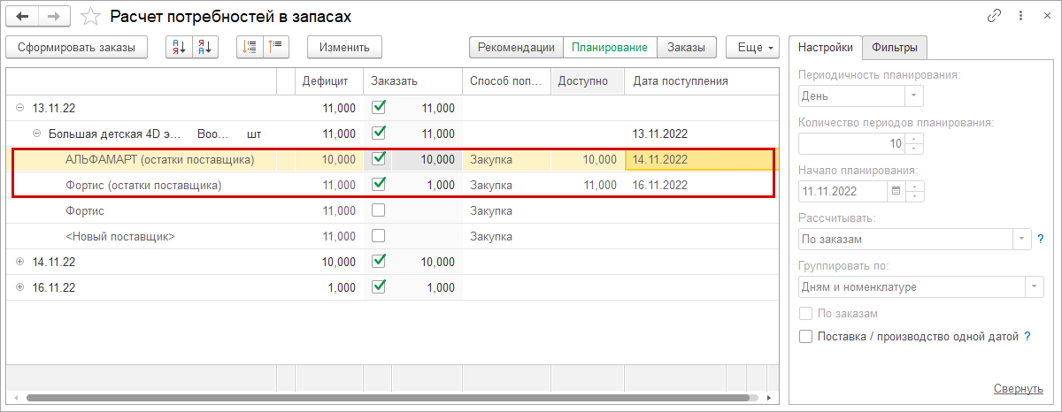 Товары, которые есть в наличии на складах поставщика, теперь отображаются в расчете потребностей в первую очередь. Таким образом, можно быстро сформировать заказы с учетом приоритетных поставщиков, наличия у них конкретных товаров и сроков пополнения.