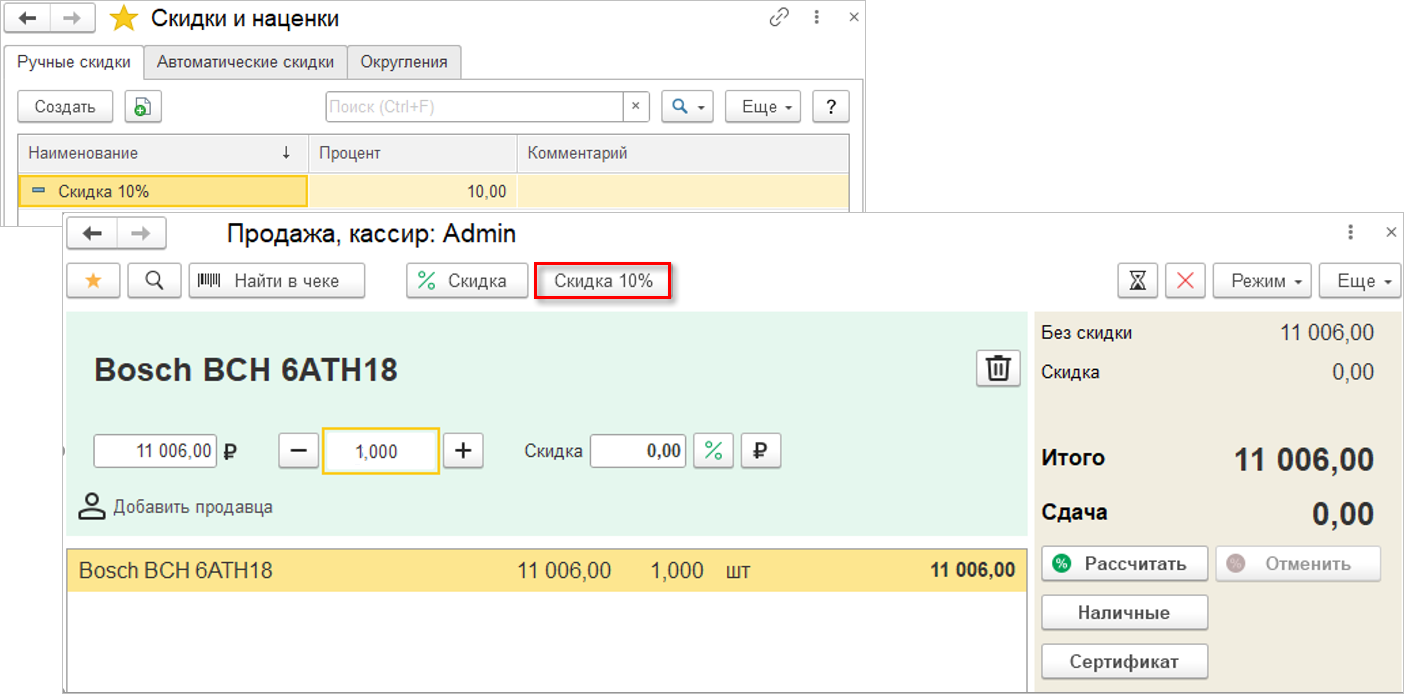 Работать со скидками в РМК стало удобнее, можно использовать управляемые скидки, т.е. предварительно настроенные в программе ручные скидки. При наличии одной управляемой скидки кнопка будет иметь значение данной скидки, при нажатии на которую сразу произойдет расчет.