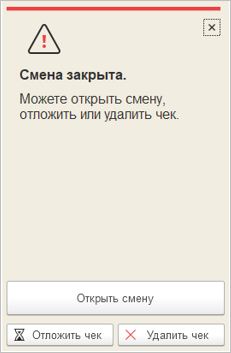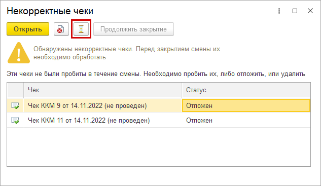Закрыть кассовую смену можно только, когда все отложенные за день чеки обработаны: пробиты, отложены или помечены на удаление.