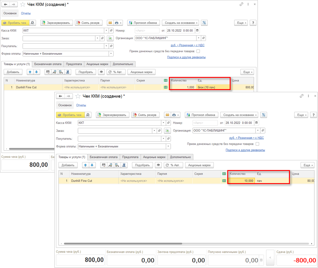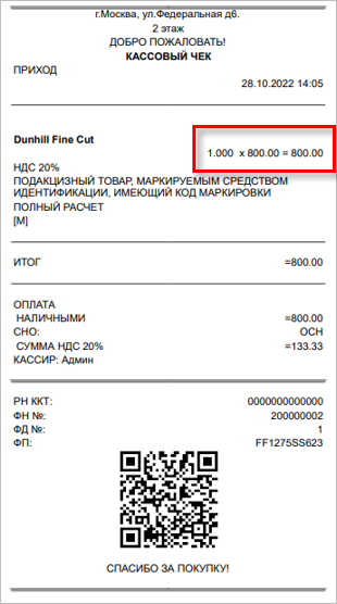 При пробитии чека с потребительской упаковкой маркируемой продукции, например блок сигарет, количество и цена будут соответствовать данным упаковки.