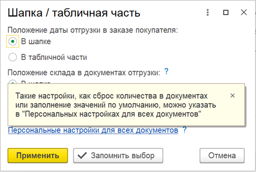 В форме Шапка/Табличная часть документов добавлена ссылка на персональные настройки пользователя.