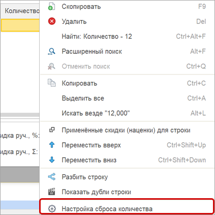 Настройку сброса количества можно открыть также в контекстном меню.
