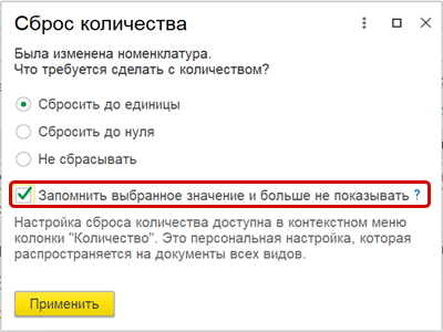 При изменении номенклатуры, если количество в строке отличается от количества в персональной настройке пользователя, появляется диалоговое окно с возможностью выбора способа сброса количества.